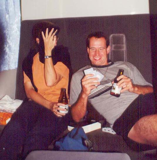 Abends haben wir dann den Nachtzug nach Chiang Mai genommen, was lustig war, da Drew und Colina ein benachbartes Abteil hatten, bei dem wir die Zwischentür öffnen konnten. So haben wir Karten gespielt und Bier getrunken [Katrin und ich im Zug].