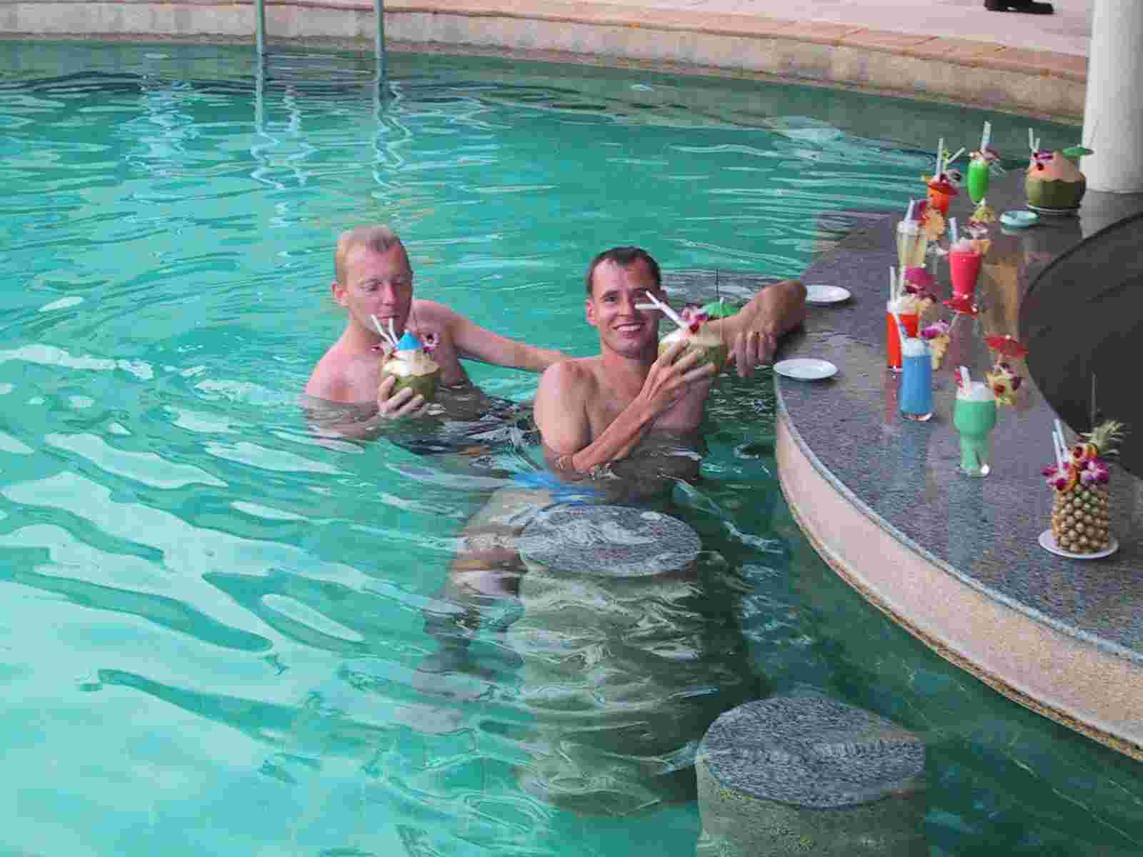 [Am Strand]. Danach haben wir noch gemütlich an ihrer Poolbar Cocktails geschlürft, bevor wir zum Abendessen gingen[Pina Colada]. Der Rest ihrer Tauchgruppe hatte aber noch ziemlich viel Stress. Sie hatten Termine bei Massage und beim Schneider, so dass es ein Kommen und Gehen war. Und dann wurde auch noch das Pokalspiel Bayern gegen 1860 live übertragen ...